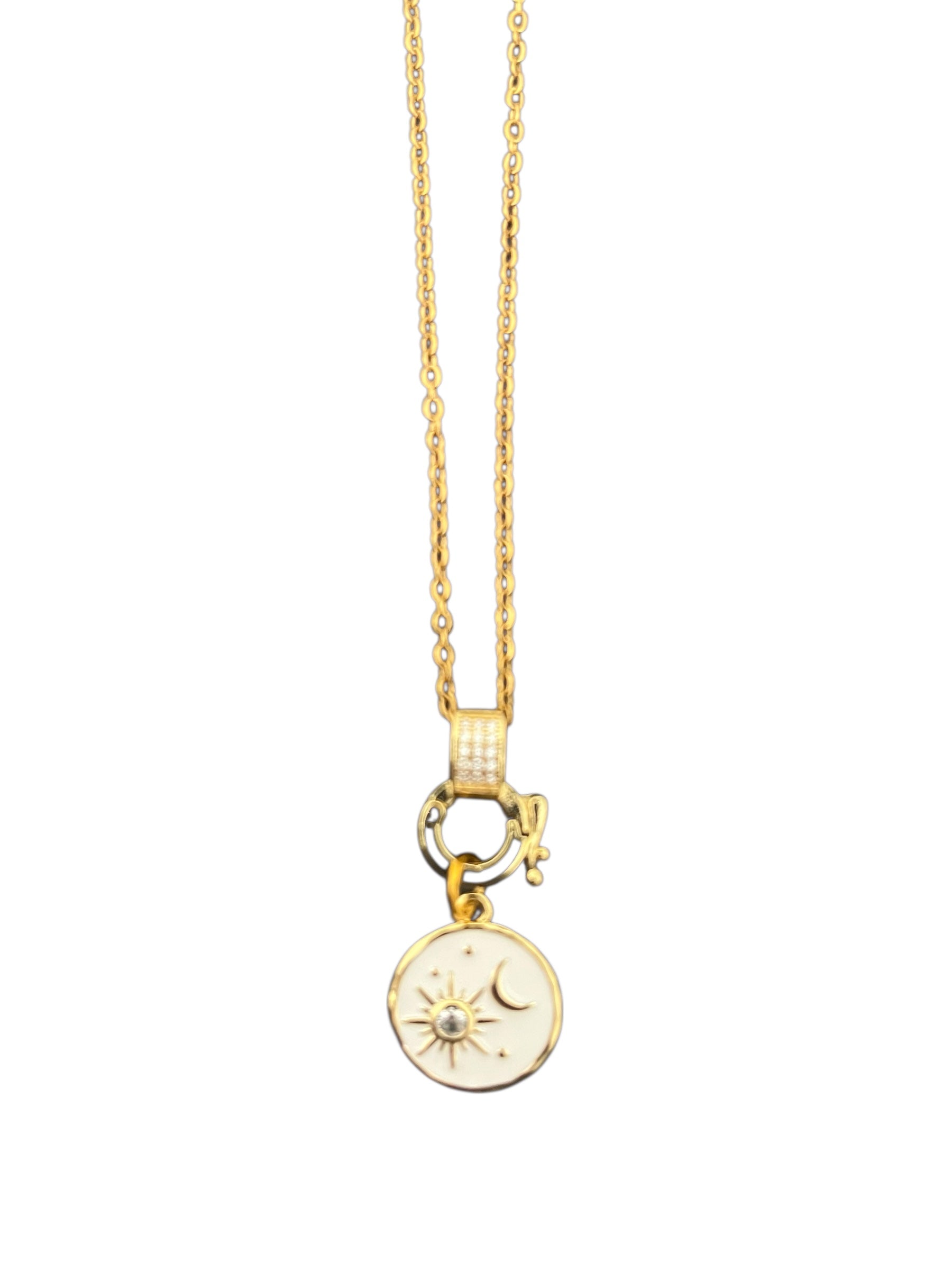 Gold fille Pave’ connector. Gold filled moon and sun white enamel pendant on stainless steel chain. 15 in with 3 in extender.